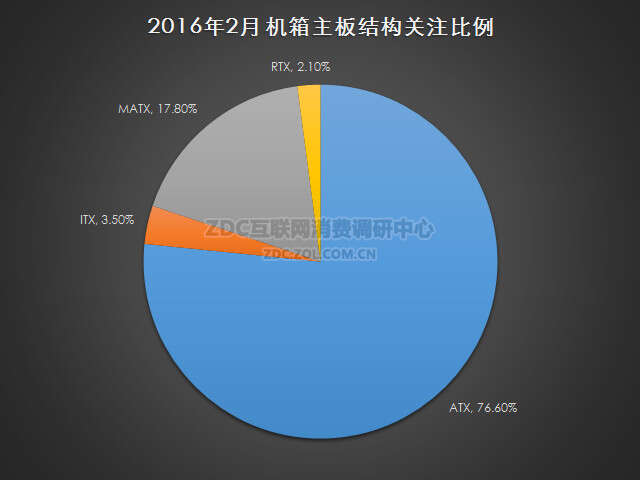 在主板结构方面,2016年2月中国的机箱市场上,ATX型的主板最受用户关注,其市场关注比例为76.60%,MATX、ITX和RTX型主板的市场关注比例分别是17.80%、3.50%和2.10%。