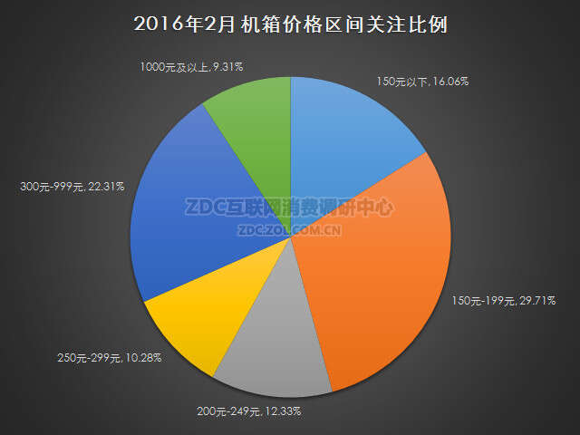 在价格方面,2016年2月中国的机箱市场上,150元-199元的机箱最受用户的青睐,其市场关注比例为29.71%,300元-999元产品的市场关注比例为22.31%,150元以下的产品市场关注比例为16.06%,价格为200元-249元的产品市场关注比例为12.33%,250元-299元及1000元以上的产品市场关注度占比分别是10.28%和9.31%。