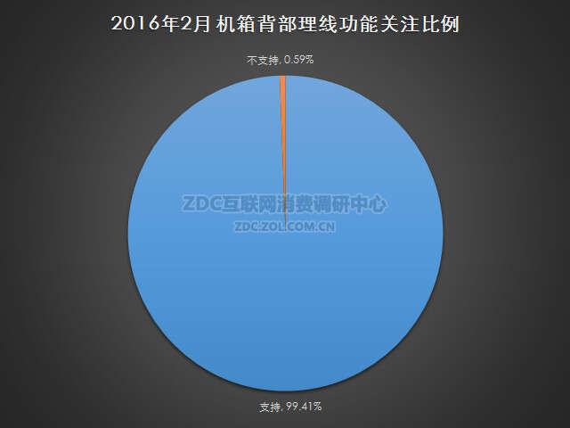2016年2月中国的机箱市场上,支持背部理线功能的机箱市场关注比例为99.41%,不支持机箱背部理线功能的产品市场关注比例只有0.59%。