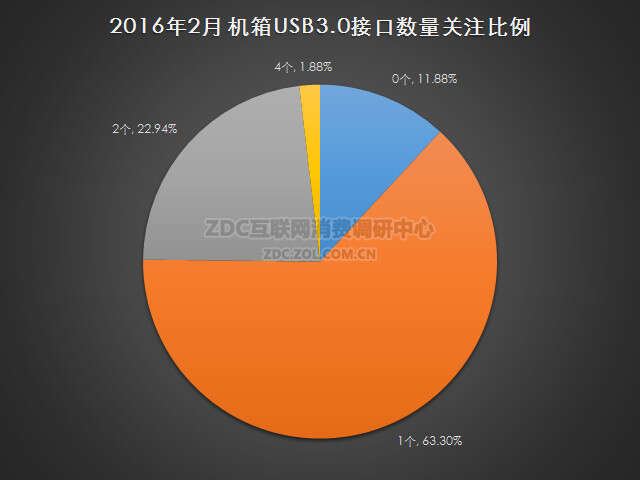 在USB3.0接口数量方面,2016年2月中国的机箱市场上,拥有1个USB3.0接口的机箱市场关注比例为63.30%,2个USB3.0接口的机箱市场关注比例为22.94%,无USB3.0接口及4个USB3.0接口的机箱市场关注比例分别为11.88%和1.88%。