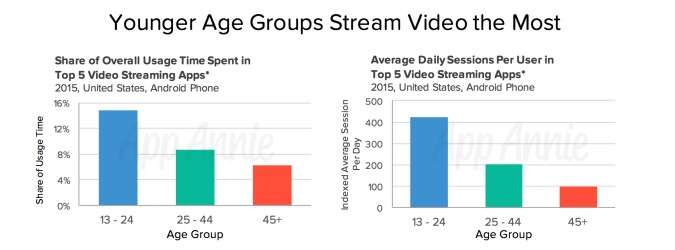 报告显示,除了偏爱聊天应用,如今的年轻用户还是手机流媒体视频服务的重度消费者,他们花在前五大Android流媒体应用上的时间是45岁以上用户的两倍以上。年轻用户每天对这些应用的访问也更为频繁,是45岁以上用户的四倍以上。