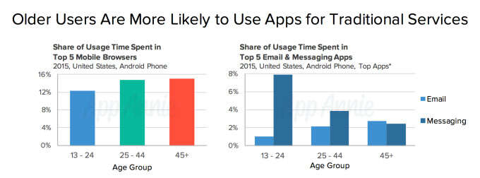 年龄在13岁至24岁的用户目前花在聊天应用上的整体时间,是45岁以上用户的逾3.5倍。年龄更大的用户依旧习惯使用复制了桌面功能的应用,比如电邮和网络浏览器。