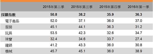 采购指数由2015年第四季的35.9上升至2016年第一季的36.3。不过,指数仍处于50的分水岭以下,显示采购活动于短期内可能收缩。受访公司可能预期投入成本下跌及/或需求不振。2016年第一季,机械及电子产品业的指数最高,分别为38.9及37.0,而珠宝业的指数连续第二季下跌,仅为27.4,是自2009年第三季以来最低水平。