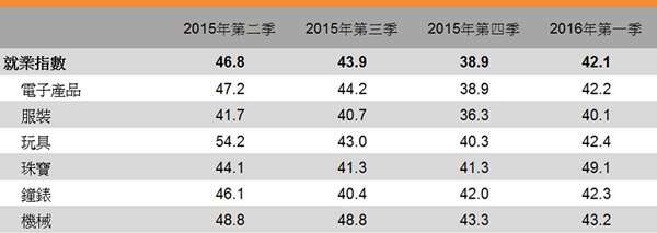 就业指数由2015年第四季的38.9微升至2016年第一季的42.1。除了机械之外,所有行业的指数均较上季有所上升。2016年第一季,珠宝业的招聘信心最高,指数达49.1,差不多处于中立水平,而服装业的指数最低,仅为40.1。