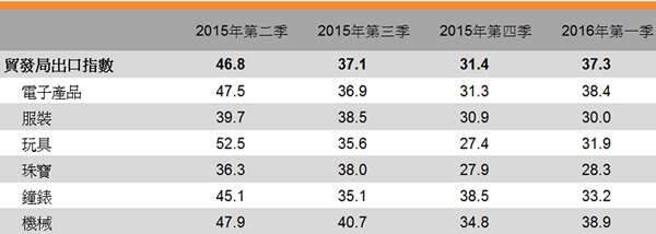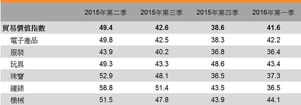 贸易价值指数由2015年第四季的38.6上升至2016年第一季的41.6,但仍然处于「负面」区域。所有主要行业的指数均低于50,反映单价于短期内料将下跌,但电子产品、珠宝及机械业的指数均较上季有所上升。