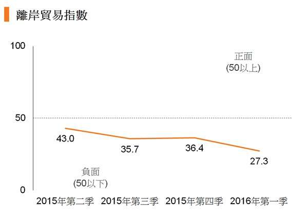 离岸贸易指数由2015年第四季的36.4进一步下跌至2016年第一季的27.3,反映香港出口商对其离岸贸易(非经香港付运但由香港贸易商处理的贸易)表现持悲观态度。鉴于这项指数低于香港贸发局出口指数,短期内,香港离岸贸易的表现将较整体出口逊色。