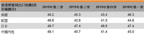 - 出口商对所有主要市场的悲观程度均告减弱,其中日本的指数最高,2016年第一季达47.4。
