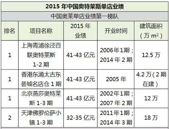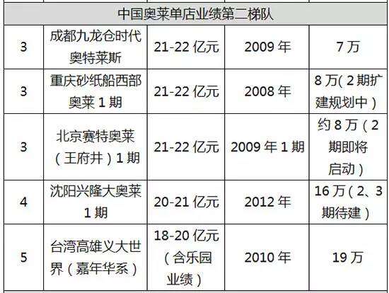 其他如成都时代奥特莱斯、重庆砂之船西部奥莱、北京赛特奥莱、沈阳兴隆大奥莱、高雄义大世界5大奥莱年业绩首次超过20亿元门槛,使2015年营业额超过20亿元的奥莱项目达9家。
