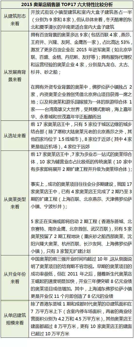 在2015年业绩排名前17的奥莱店王(多家并列)中,年业绩均超过8亿元,这些奥莱在建筑形态、发展商背景、选址、开业时间、分期扩建、奥莱类型等方面与其他项目有何差异?▼