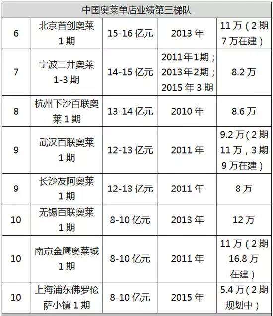 另有宁波杉井、杭州百联、北京房山首创、武汉百联、长沙友阿、无锡百联、南京仙林金鹰奥莱城、上海浦东佛罗伦萨小镇八大奥莱项目的2015年营业额位于8-16亿元之间。以及13家2015年营业额在4.5-8亿元之间的奥莱项目。