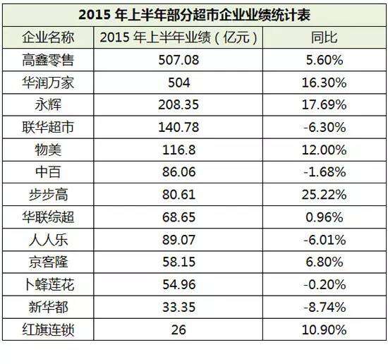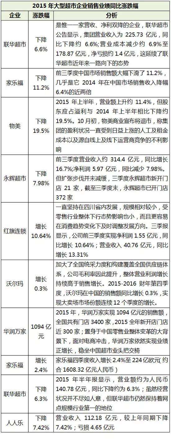 1、2015年大型超市企业销售业绩普遍下滑