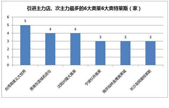引进主力店、次主力最多的6大奥莱分别是:台湾高雄义大世界、香港东荟城名店仓、沈阳兴隆大奥莱、宁波杉井奥莱、南京仙林金鹰奥莱城、长沙友阿奥特莱斯。▼