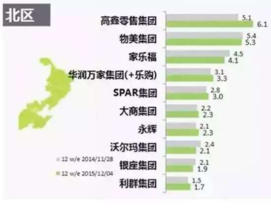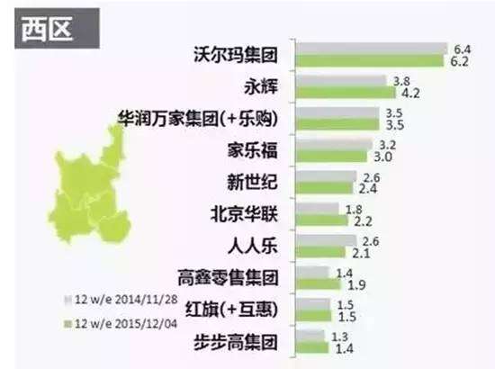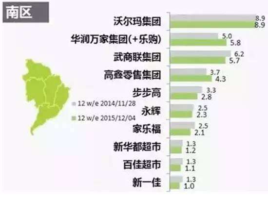 步步高在南区的市场份额稍缩减,同期下降0.5%。受其影响,步步高在全国范围内的市场份额下降到2.8%。但该集团在西区依然获得增长,市场份额达1.4%, 同期对比增长0.2%。对广西南城超市的收购进一步推动步步高在西区扩张的潜力。▼