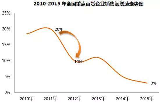 根据国内重点百货企业销售额度增速的数据来看,自2012年百货销售额第一次下跌后,从2012年的10%一直降到2015年的3%。▼