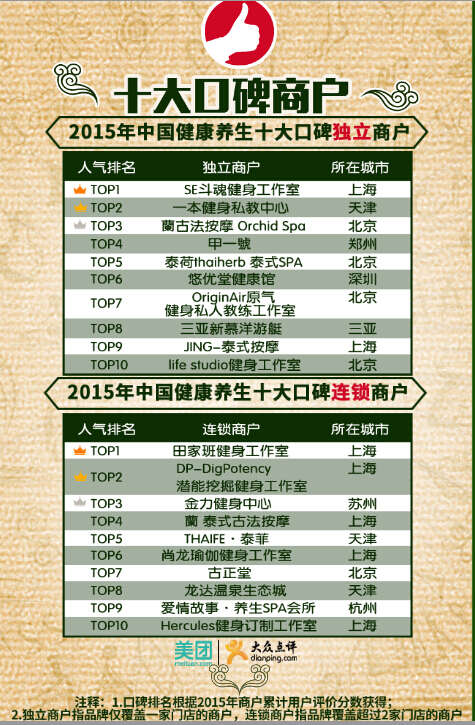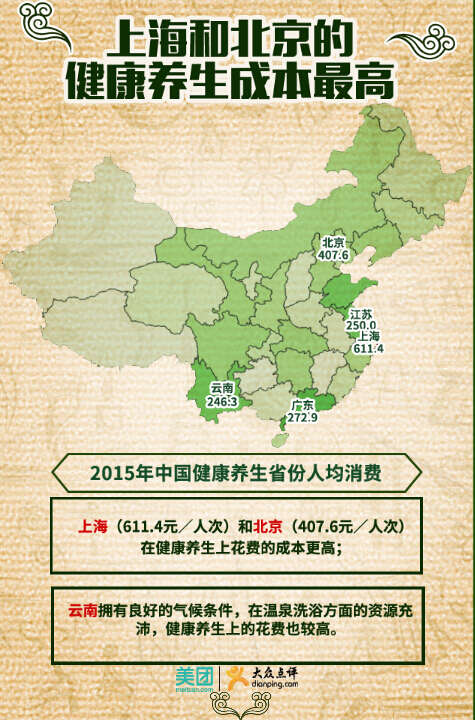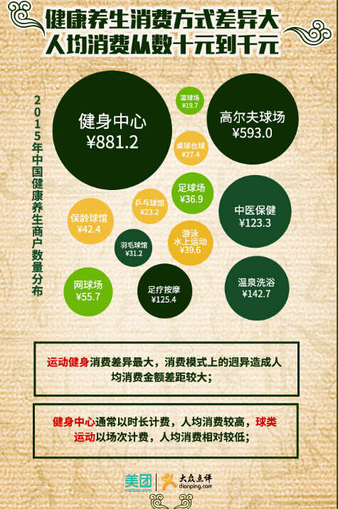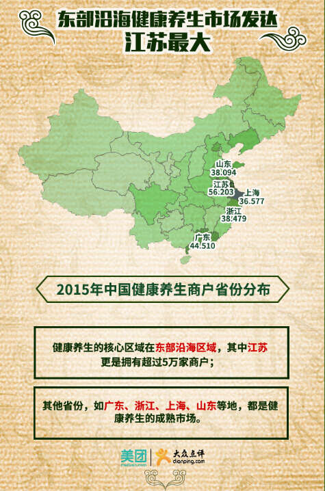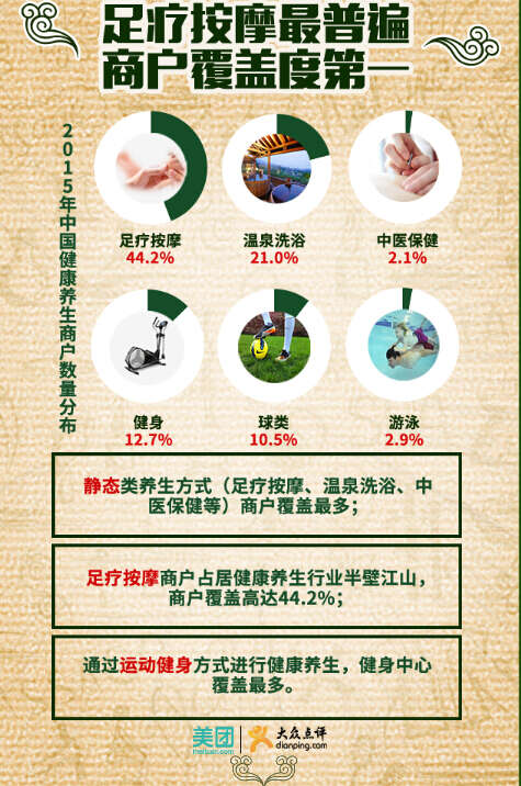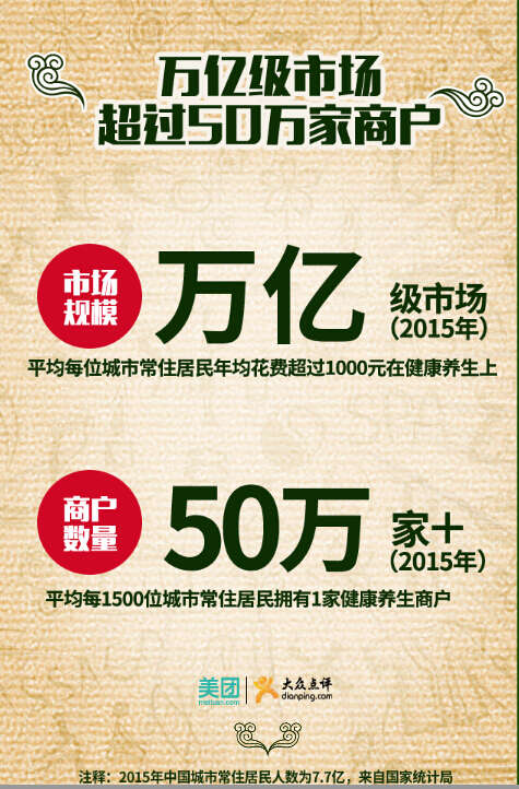 ——近日,美团大众点评研究院发布的《中国健康养生大数据报告》指出,目前,中国健康养生市场规模已经超过万亿元,市场不仅巨大且增长快速。据统计,目前美团大众点评收录的健康养生商户超过50万家,仅2015年新增收录的商户数量占养生保健商户的比例高达57.9%。