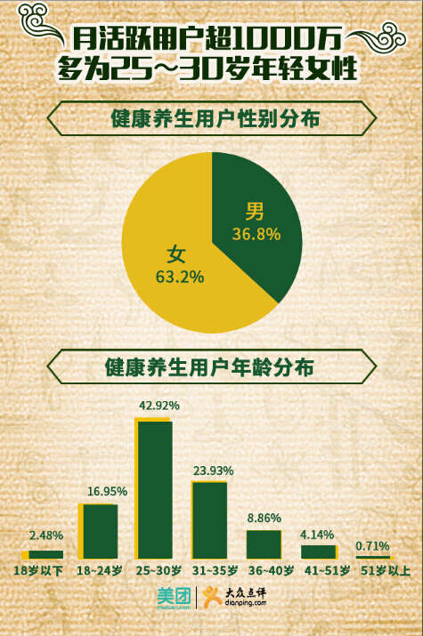 ——然而,用户评价最佳的五星商户的互联网化比例超过90%,意味着在注重消费体验的健康养生行业中,商户的服务品质和用户体验口碑借助O2O平台形成了正向互动。报告同时指出,通过互联网关注健康养生的人群月度活跃用户超过1000万人,显示出在互联网+的浪潮下,健康养生产业需要及时抓住机遇,迭代发展。