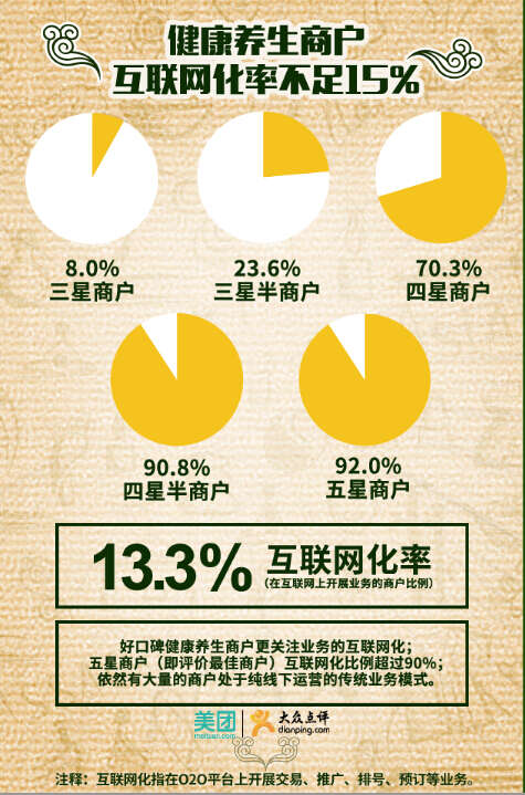 ——值得关注的是,报告指出,大部分健康养生商户依然处于纯线下运营的传统业务模式,健康养生商户互联网化率较低。根据美团大众点评收录数据统计,在互联网o2o平台上开展交易、推广、排号、预订等业务的商户占比仅为13.3%。