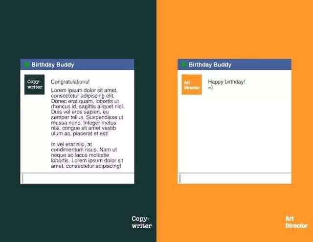 文案和艺术总监都是需要创新的职业,但是却有很多不同。到底不同在哪里呢?这个在Facebook上受人关注的“CW”对战”AD“的项目用最简洁的方式展现出了各种的不同。