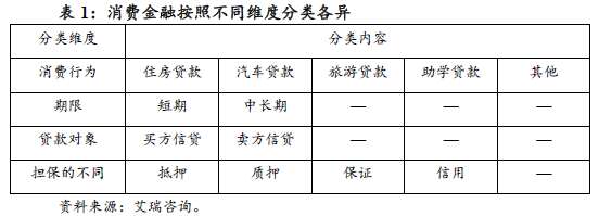 消费金融是广义概念,根据不同标准可以有不同分类。根据艾瑞咨询研究,基于消费者购买行为,消费金融包括住房消费金融、汽车消费金融、信用卡以及其他消费品消费金融;根据贷款期限不同,又分为短期消费贷款以及中长期消费贷款等形式;按接受贷款对象的不同,消费信贷又分为买方信贷和卖方信贷。其中买方信贷是对购买消费品的消费者发放的贷款,如个人旅游贷款、个人综合消费贷款、个人短期信用贷款等。卖方信贷是以分期付款单证作抵押,对销售消费品的企业发放的贷款,如POS贷款等;按担保的不同,又可分为抵押贷款、质押贷款、保证贷款和信用贷款等。