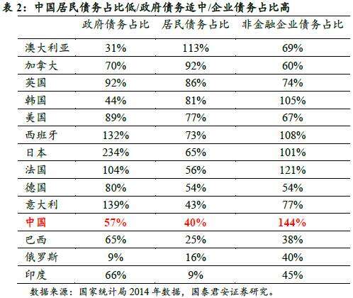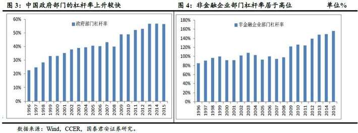 中国企业和政府的高杠杆一起引起了经济学家广泛关注,系统性风险不可不察。根据国泰君安宏观研究团队研究,截止2015年末,政府部门债务占GDP比重为56.5%,居民部门为39.9%,非金融企业部门为143.5%,金融部门为21.0%。全社会杠杆率为260.8%,实体经济杠杆率为239.8%。从国际比较来看,中国实体经济的杠杆率处于中游水平,但非金融企业的杠杆率是主要经济体中最高的。