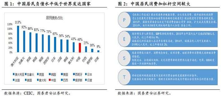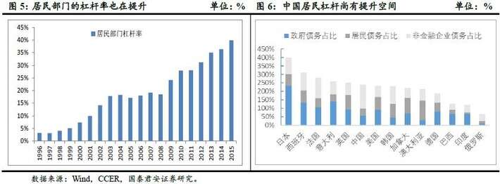 目前中国消费性贷款余额占贷款余额总量的比例只有20%左右,与欧美发达国家的50%左右的比例相比有着明显的差距;从居民部门债务占GDP比重的角度看,我国的比例仅为39.9%,而同期美国为77%,日本为65%,欧洲国家普遍在50%以上。我国居民消费领域具有温和提升杠杆空间。