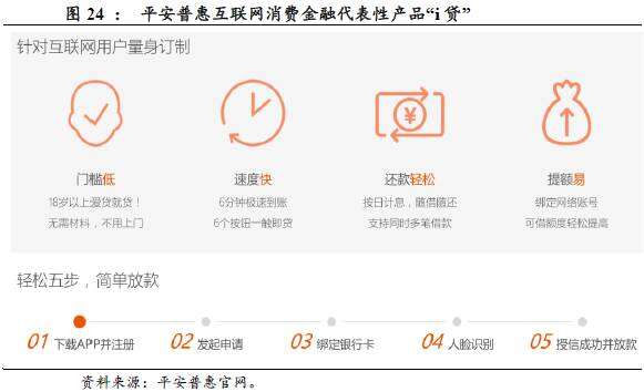 平安普惠提出围绕“医食住行玩”,从生活切入,搭建互联网金融平台,形成“四个市场、两朵云、一扇门”的互联网金融战略体系,其“平安i贷”为互联网消费金融的代表性产品。平安i贷的最大亮点是贷款流程的巨大优化,客户无需前往门店办理,只需要下载“平安易贷”App,通过人脸识别技术,打开手机摄像头自拍一张照片,系统就会进行一系列的验证、匹配和判定,完成身份核实,人脸识别技术精确程度可达99%。整个贷款申请流程十分简便,可以线上完成贷款申请、审批和放款等流程,最快6分钟可实现到账,并且还款时间和还款方式十分灵活,支持随借随还,按日计息。“平安i贷”满足年轻族群“小、快、频、急”的消费需求,18岁以上即可申请;手续简便,申贷、支用、还贷均可在手机APP上完成,其全流程的互联网化领先业界。