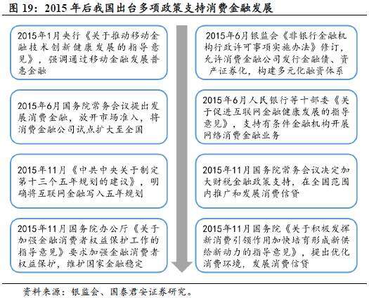 2015年,国务院及各部委出台了一系列政策,这持续利好消费金融行业发展,行业春天已至。我国在前期稳步试点、逐步放开的基础上,2015年6月10日,国务院常务会议决定,放开消费金融市场准入,消费金融公司试点从16个城市扩大至全国。审批权下放到省级部门,并鼓励符合条件的民间资本、国内外银行业机构和互联网企业发起设立消费金融公司;鼓励消费金融公司通过发行金融债、资产证券化等方式拓宽融资渠道。在得到官方政策力挺后,消费金融的行业热度持续升温。各大银行、电商平台、互联网金融公司等纷纷进入消费金融市场。