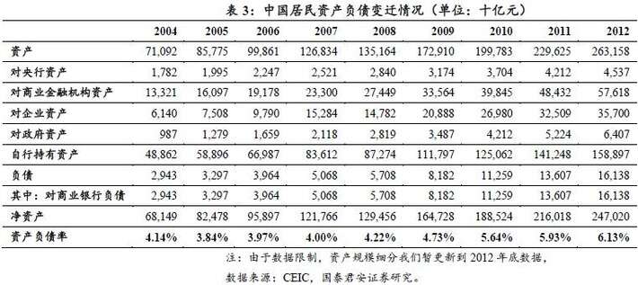 从中国居民的资产负债表结构而言,随着经济的快速发展,居民资产规模从2004年的71.1万亿元增长至263.2万亿元,年均增长17.77%;但是自2005年以来,由于负债端增长速度持续高于整体资产增长,资产负债率从2005年的3.84%缓慢升高至2012年的6.13%;但另一方面,我国居民资产负债率在国际范围内仍属于明显偏低的水平,存在加杠杆空间。