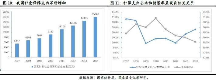 “十三五”期间,建立更公平可持续的社会保障制度将成为我国社保体系发展的重点方向:一方面,保险费率有望下降;另一方面,全民参保计划实施,“十三五”末期基本实现法定人员全覆盖,这不仅需要政策层面加强对社保体系的顶层制度机制设计,还需要财政社保支出的持续扩大;而我国明显偏高的储蓄率也有望长期走低,释放消费需求。