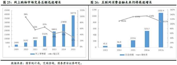 互联网技术对消费方式的渗透逐渐深化,线上和移动终端的电商新消费模式以其独特的便利、快捷,将激发更多大众消费需求。2015年,限额以上网上零售额为38773亿元,同比增长33.3%,占社会消费品零售总额的12.9%,比上年同比提高2.3%。实体商业成本的提高和移动互联网的普及推动流通方式不断创新,微商、跨境电商等新型流通方式层出不穷,电商行业呈现线上线下融合趋势。流通方式创新带来了更加便捷、多样的消费方式,激发了一部分新的消费潜力释放,成为消费金融发展的新机遇。
