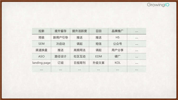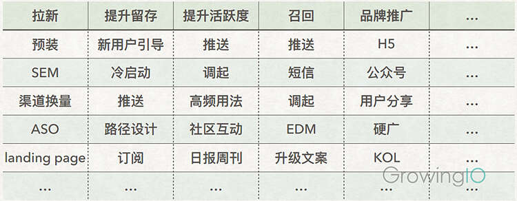下表列举了常见的增长武器,在拉新、留存、提升活跃度、用户召回和市场推广等不同场景下,有不同的选择。