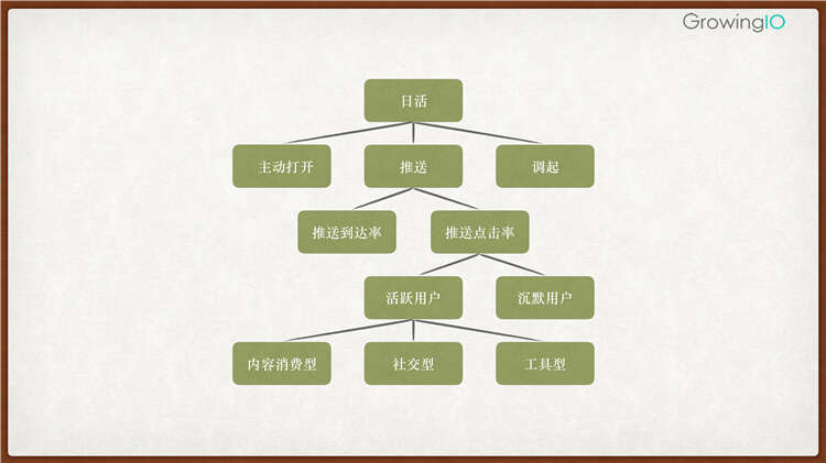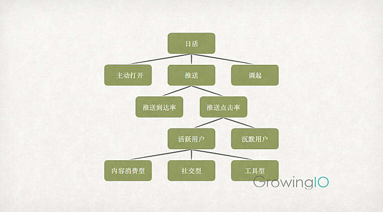 活跃用户会主动打开我们的APP;同时不活跃用户,我们要向他推送信息,借此唤醒他们;最后还可以在微信或者其他APP页面中打开我们的APP(也称调起)。这样就把日活跃用户指标拆成三个指标:主动打开,推送和调起,方便进一步执行。以推送为例,它由两方面组成:推送到达率和点击率。优化到达率和点击率,进一步方便了实际执行和落实。