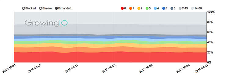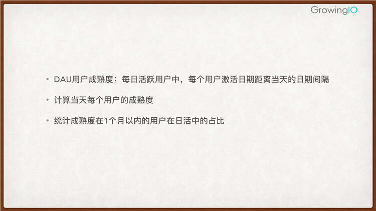 2.当成熟度1个月以内的活跃用户占日活跃用户的比例低于30%,说明我们的产品逐渐成熟。这时需要把目光放到存量用户上,提升存量用户的活跃度;但是也要兼顾第一类问题。