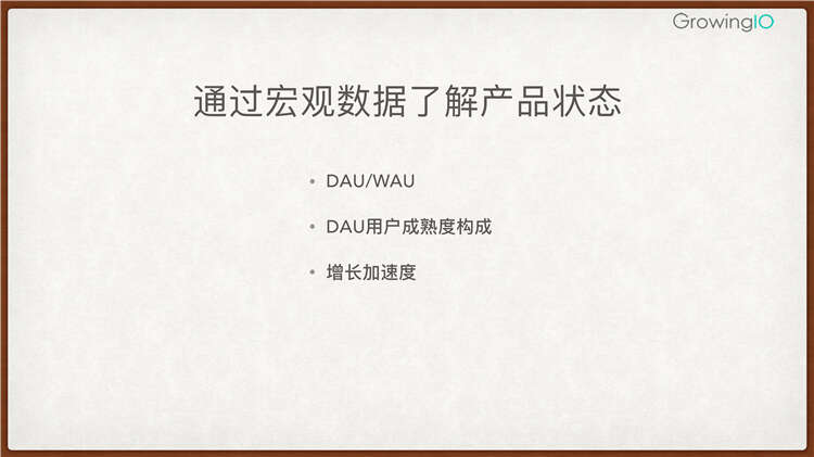 反映产品状态的指标很多,如PV/UV/DAU等等。在这里我们主要介绍3个指标,分别是DAU/WAU,DAU用户成熟度构成和增长加速度。