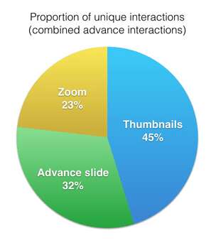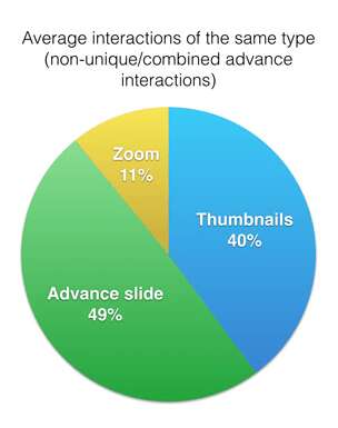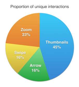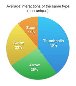 独特交互的比率缩放是第二受欢迎的交互方式。缩放与滑动类似,因为在所有交互方式中,它有着最大的触发空间——你可以点击轮播中的任何位置去触发它。我们必须假设我们统计的一部分缩放交互是无意识地错误点击。即使这样,缩放的比例依然很高——高到不可能是偶然的。在所有用户中,大约23%的用户会通过缩放功能进行交互。