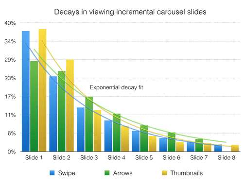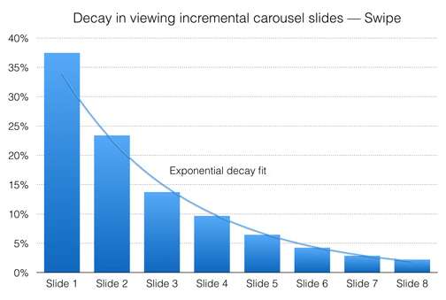 数据表明用户滑动轮播的行为大致呈线性规律。不同的轮播切换方案会产生不同的结果。所有数据都表明多数用户会查看下一张轮播图。与首张轮播图进行交互的用户中,至少有64%的比例会与第二张发生交互。