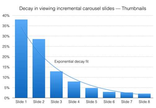 对于每一张查看过的缩略图,用户大概有69%的概率会查看下一张。下图中的指数衰减比率能够更精确的匹配这一趋势。尽管用户可以以任何顺序查看缩略图,多数缩略图用户还是会按照轮播中的顺序查看图片。