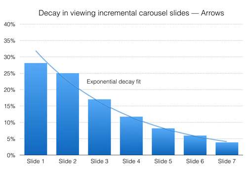 对于每一个点击过的箭头,我们发现用一个近似线性关系的指数模型描述更为精确。在这种线性关系中,用户约有76%的概率点击下一张轮播图。