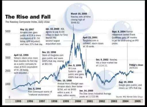 互联网泡沫开始应该是从1999年开始的,那时候美国处于一个相对低息的周期,只有4%左右的利率。流动性开始涌入以互联网企业为代表的,新兴经济体,特别是在GDP增长,以及股市攀升带来的纸上富贵错觉影响下,拉动的消费增长,极大的增加的企业营收,越来越多的企业愿意在这些互联网公司身上投放网络广告。网络广告,也就是横幅banner,是当时互联网企业唯一的能够盈利的商业模式。新经济概念+营收增长+新商业模式故事带来的预期增长(其实就是网络销售 B2C B2B),形成戴维斯双击错觉+正循环效应。让所有的人都心潮澎湃,nasdq指数的斜率陡然攀升,互联网大泡沫开始形成。很多企业在 ipo 的时候,就享受2-5倍的股价攀升,分析师、投资者、企业家、风投、银行全部都陷入狂热的情绪当中,everybody is winner,no loser.