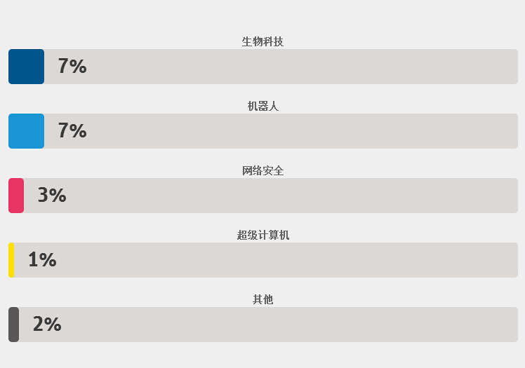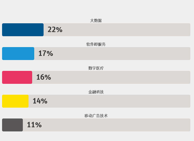 在创新经济领域中,大数据、软件即服务(SaaS)和数字医疗是受访者认为最有前景的三大领域,它们所占的比例分别为22%、17%和16%。其它受访者认为较有前景的创业领域还包括,金融科技、移动广告技术、生物科技和机器人等。