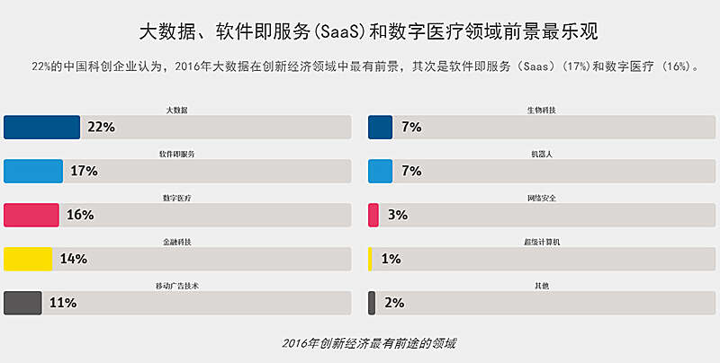 《报告》显示,85%的中国科创企业认为2016年的经营状况将比2015年更好,大数据、软件即服务(SaaS)和数字医疗三大领域的创业前景最为乐观。