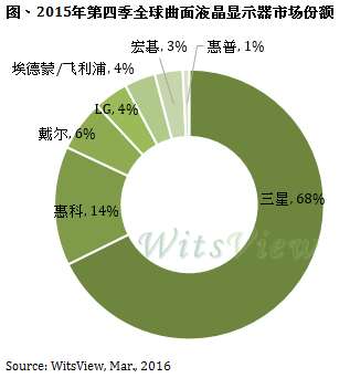 曲面液晶显示器领头羊为三星,2015年第四季销售以68%的市场份额表现一枝独秀,全年度更高过七成,除了中国市场销售告捷外,在北美市场表现亦不俗。三星以其卓越的工业设计能力及成本优势,加上投入大量资源与渠道合作,使其曲面产品成功在北美市场占有一席之地。