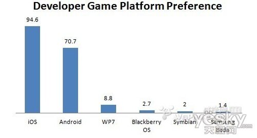 从上面的图表我们可以看到,目前的大部分开发者都愿意选择为用户群体大的iOS(94.6%)和Android(70.7%)系统开发移动游戏,而 Windows Phone 7系统以8.8%的百分比压倒了用户群体比自己大得多的Symbian(2%)和Blackberry(2.7%)系统,以及三星的Bada系统(1.4%),成为移动游戏开发者的第三大选择平台。