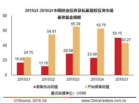 图2 2015Q1-2016Q1中国创投及私募股权投资市场募资基金规模