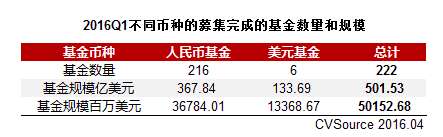 表4 2016Q1募集完成的不同币种基金的数量和规模