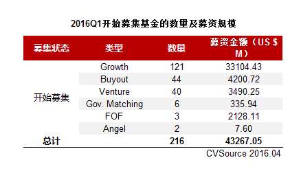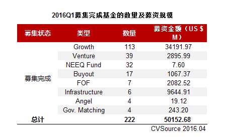根据CVSource投中数据终端显示,2016年1季度共披露出有216支基金成立和开始募集,基金募集的目标规模为432.67亿美元。其中,有165支基金披露目标募集规模,平均单支基金的目标募集规模为2.62亿美元;在募集完成方面,共披露出有222支基金募集完成,披露的募集完成的规模约为501.53亿美元,其中,有156支基金披露募集完成规模,平均单支基金的募集完成规模为3.21亿美元。