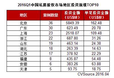 从投资地域的维度来看,2016年1季度PE市场的投资分布Top10的城市中,其中北京、广东、上海和浙江依旧是投资者的首选之地,投资案例数分别是北京36起、广东30起、上海23起和浙江22起,本季度发生在北京地区的案例金额规模也是最大的58.49亿美元。