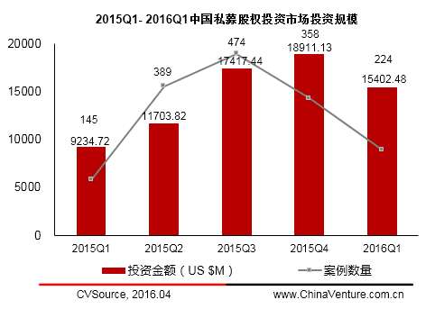 图3 2015Q1-2016Q1中国私募股权投资市场投资规模