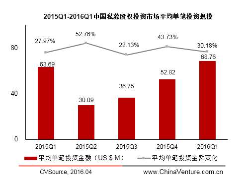 图4 2015Q1-2016Q1中国私募股权投资市场平均单笔投资规模