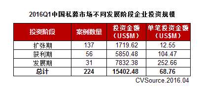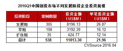 根据CVSource投资数据终端显示,2016年1季度国内PE/VC市场,其中披露的PE市场的投资案例224起,投资金额为154.02亿美元,其中发展期的企业投资案例31起,投资金额为78.32亿美元,占整个PE市场投资金额规模的50.85%;本季度VC市场披露的投资案例共计538起,投资金额规模为118.13亿美元,其中发展期的企业投资案例为305起,投资金额规模为81.96亿美元,占整个VC市场投资规模的69.38%。本季度VC市场中披露的早期企业投资的案例共计198起,从创投市场的投资案例数目来看,早期阶段的投资也很是受到投资者的追捧和青睐,投资案例数目直逼发展期的融资案例数目的。